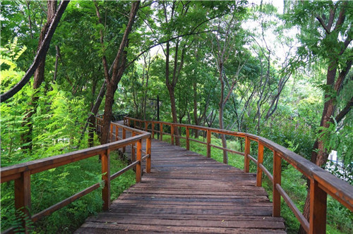 泳池旁還有一條千米木棧道,曲徑通幽,蜿蜒于林間,兩側(cè)種植有火炬樹、毛白楊、國槐、白蠟、美人梅、金銀木、連翹、地錦、紫藤等數(shù)百種植物,輔以人工濕地、石砌隧道、人工瀑布等仿自然生態(tài)景觀,四季更迭,景致紛呈。
